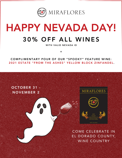 Miraflores Winery 2120 Four Springs Trail, Placerville, CA30% Off ALL Wines (with a valid Nevada ID) + Enjoy Complimentary Pouring of our "Spooky" Black Labeled Wine: 2021 Estate ...