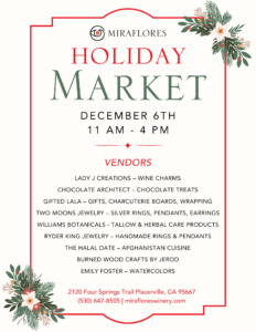 Enjoy complimentary mulled wine, enter our holiday raffle for a gift basket featuring wine and winery treats, and shop from talented local artisans offering handmade jewelry, wood-burned art, candles, body lotions, chocolates, and more. Delicious food will be available from the Afghanistan restaurant. Celebrate the season, support local makers, and sip something special!